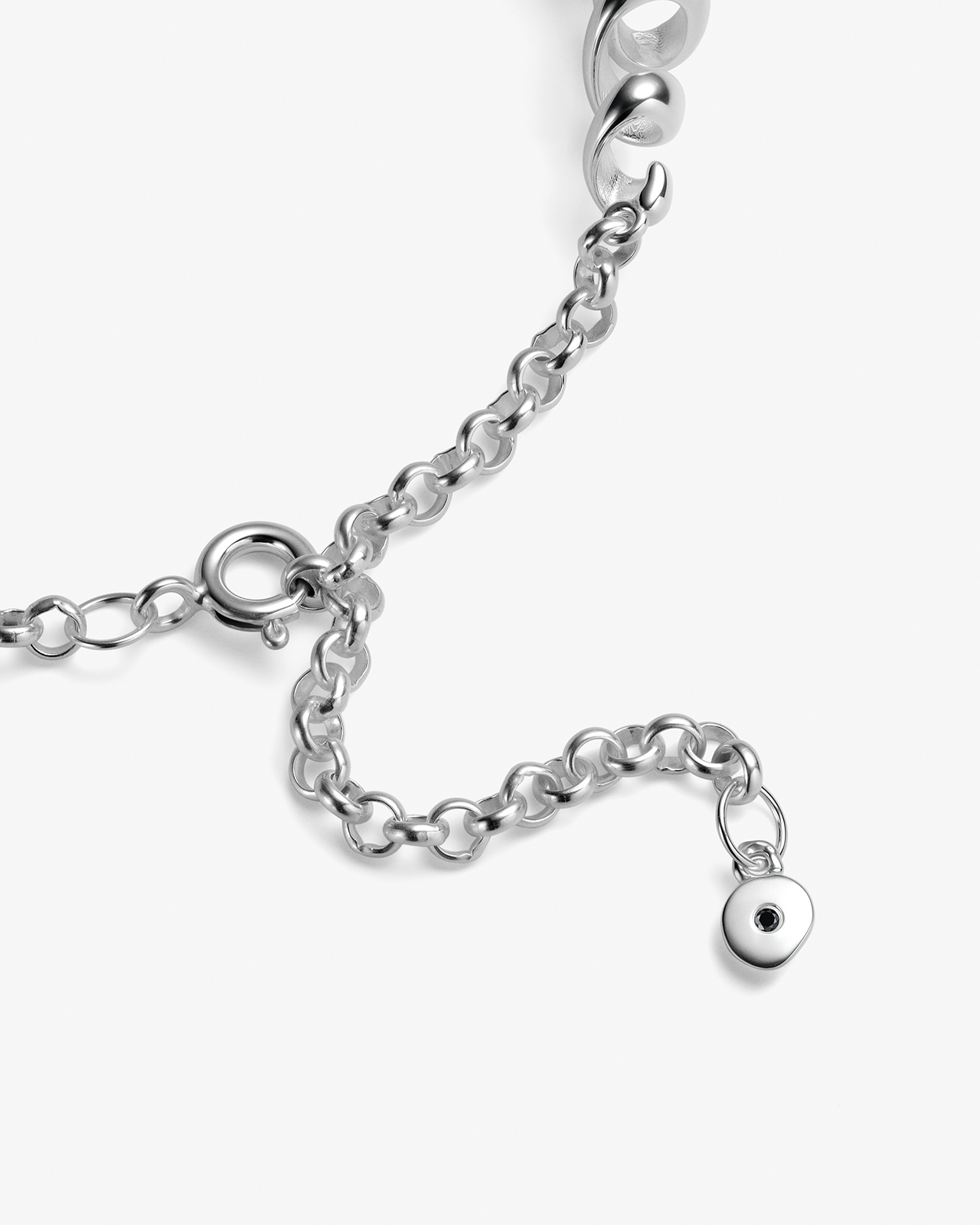 Мы сочетаем плавные линии с твердым остовом: внешняя мягкость при твердом характере. И, конечно, черный бриллиант в маленьком подвесе на конце.