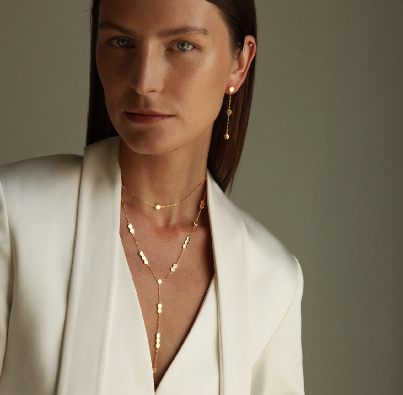 Общая длина 45 см, длина самого "галстука" (от соединения цепочек) 9 см.