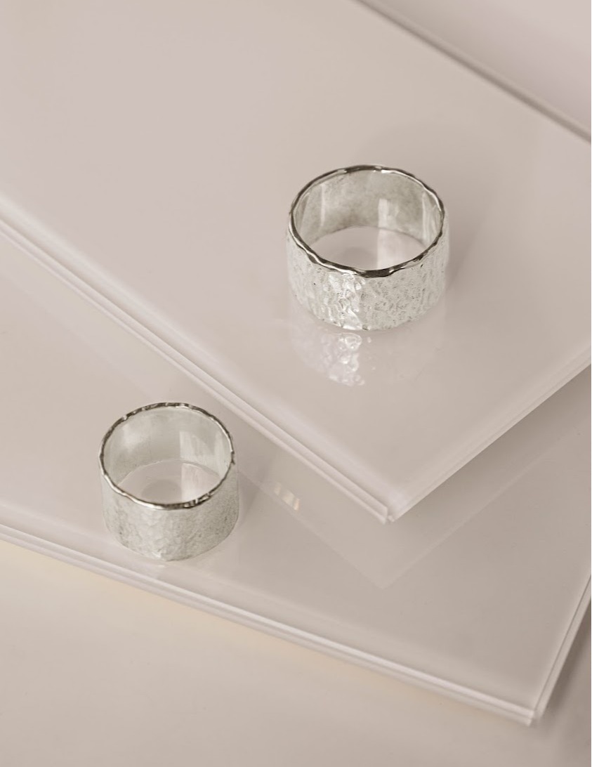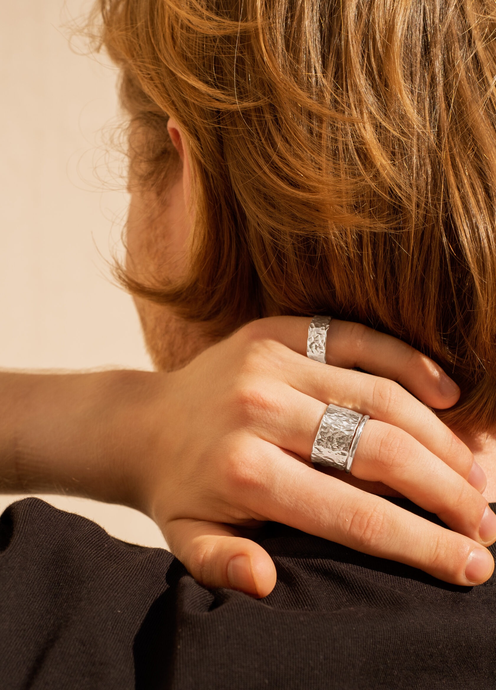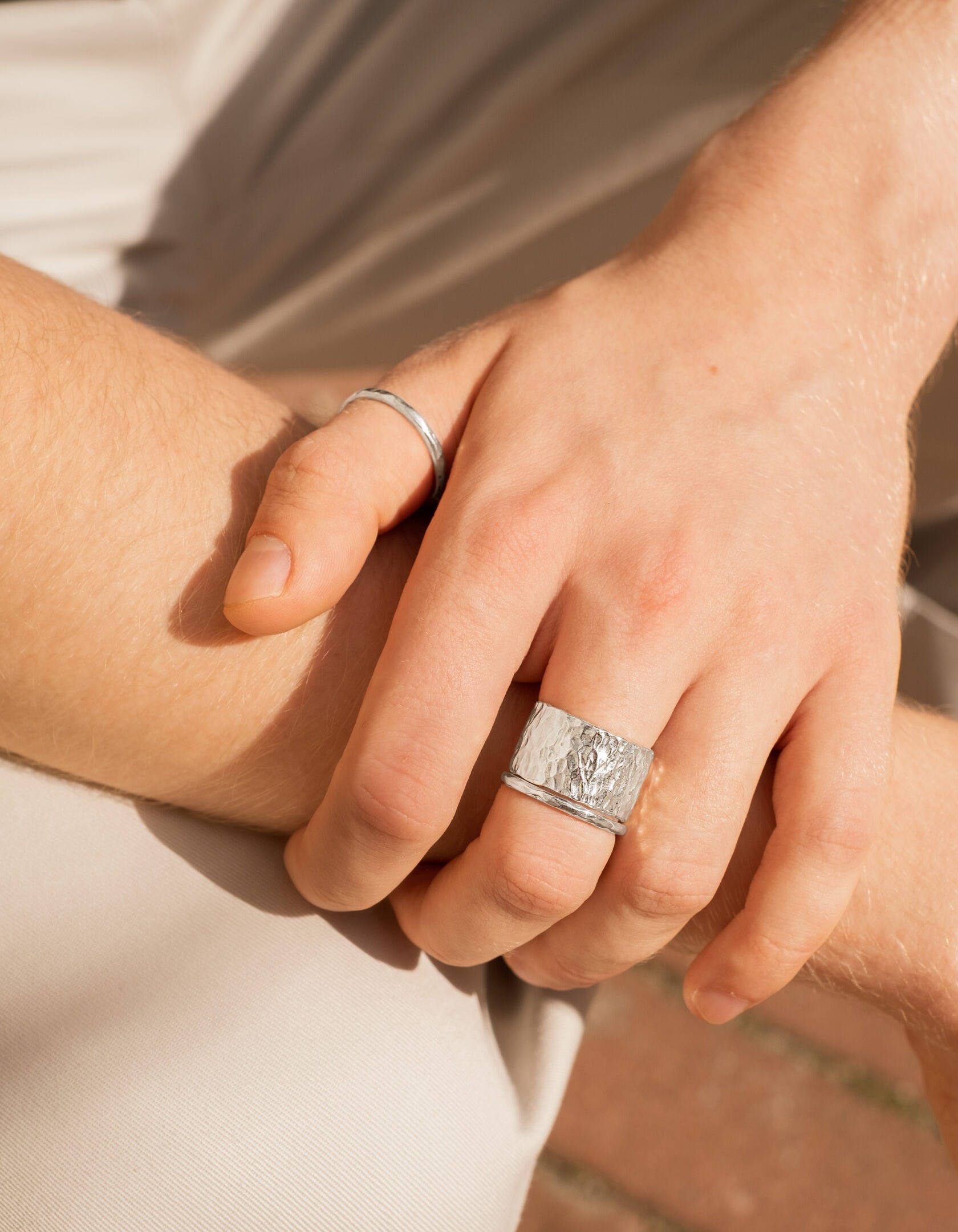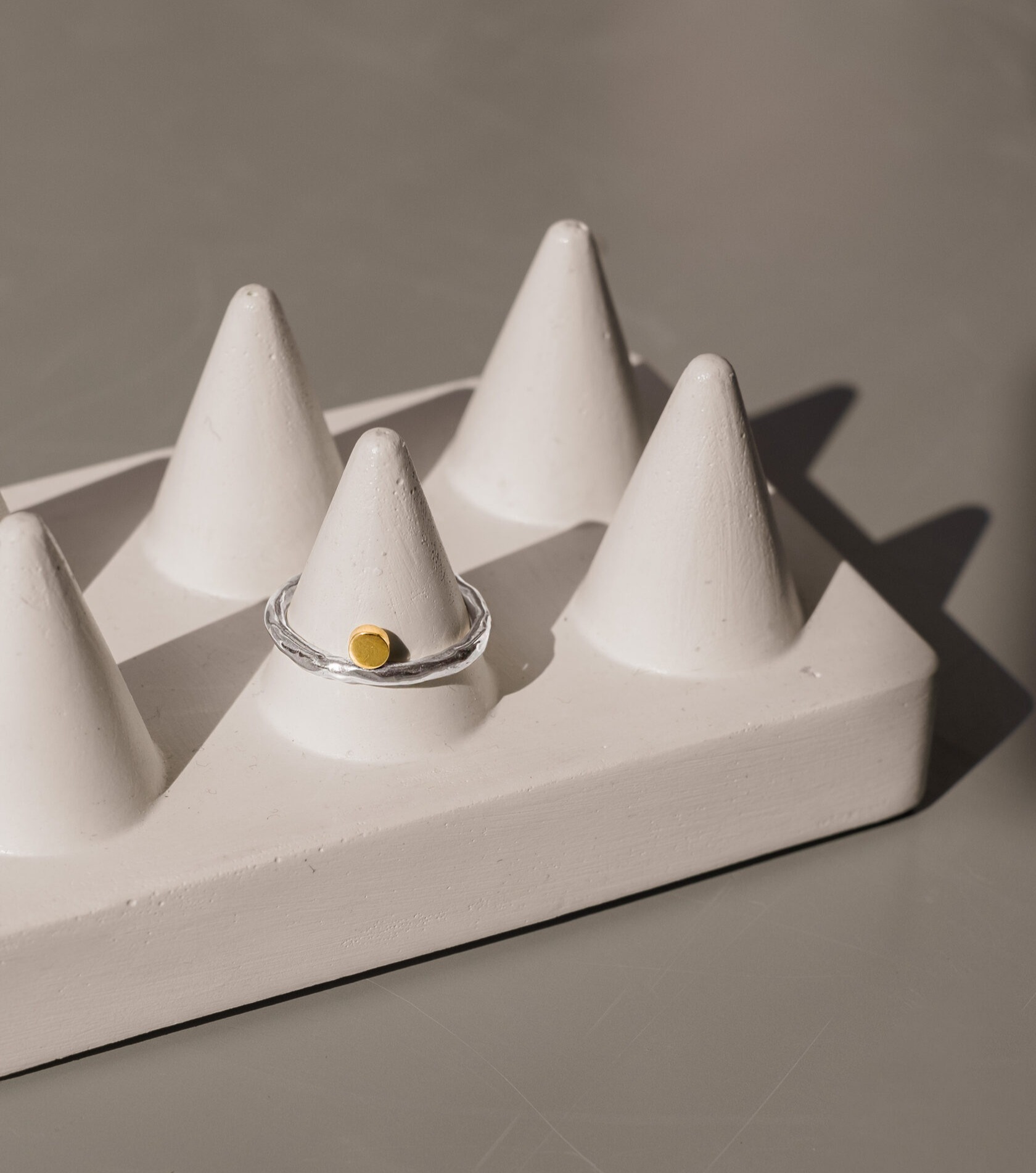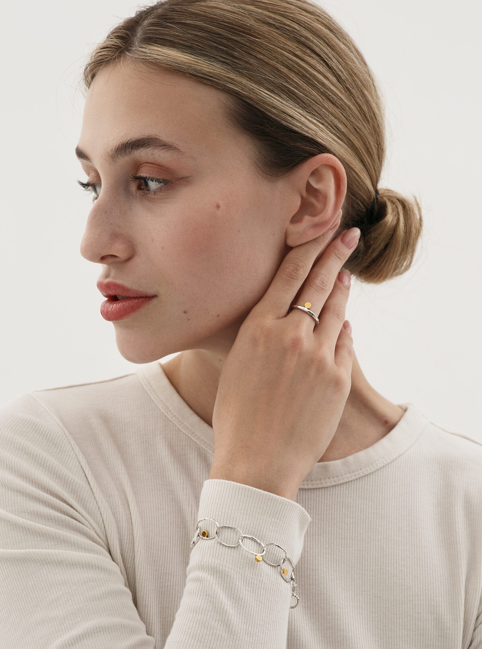 Массивное кольцо L из битого серебра со вставкой из латуни, харизматично отступающей за линию окружности. Такой легкий игривый взмах среди строгого текста прямых линий и правильных углов.