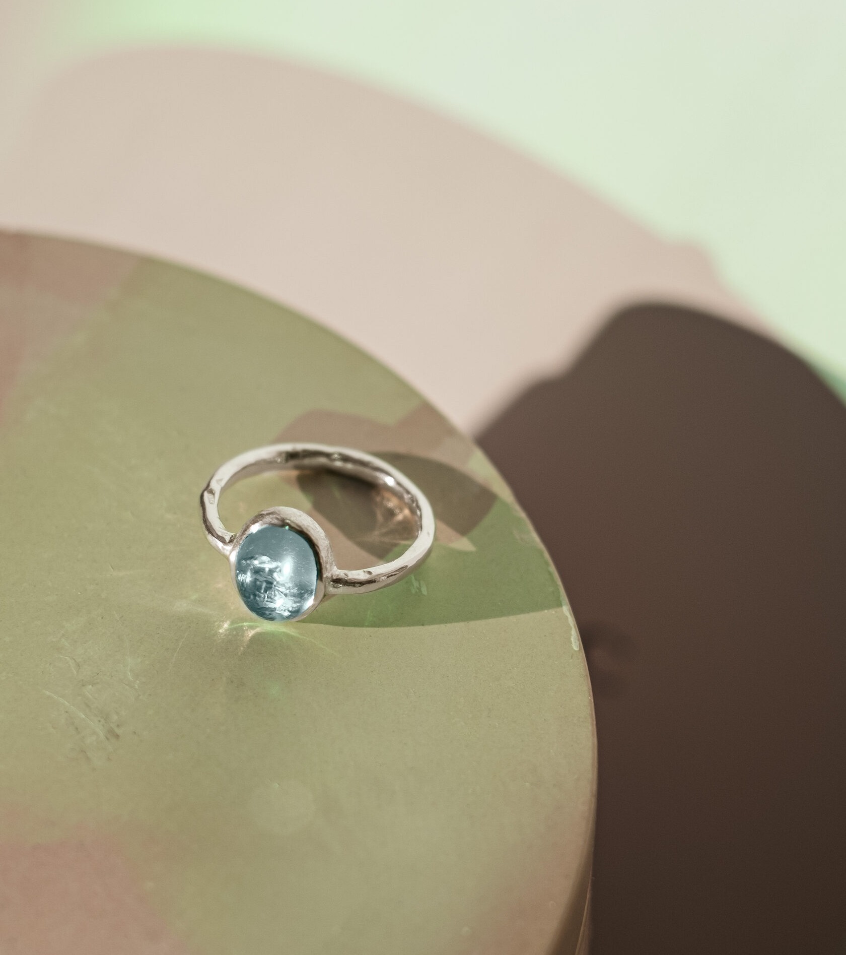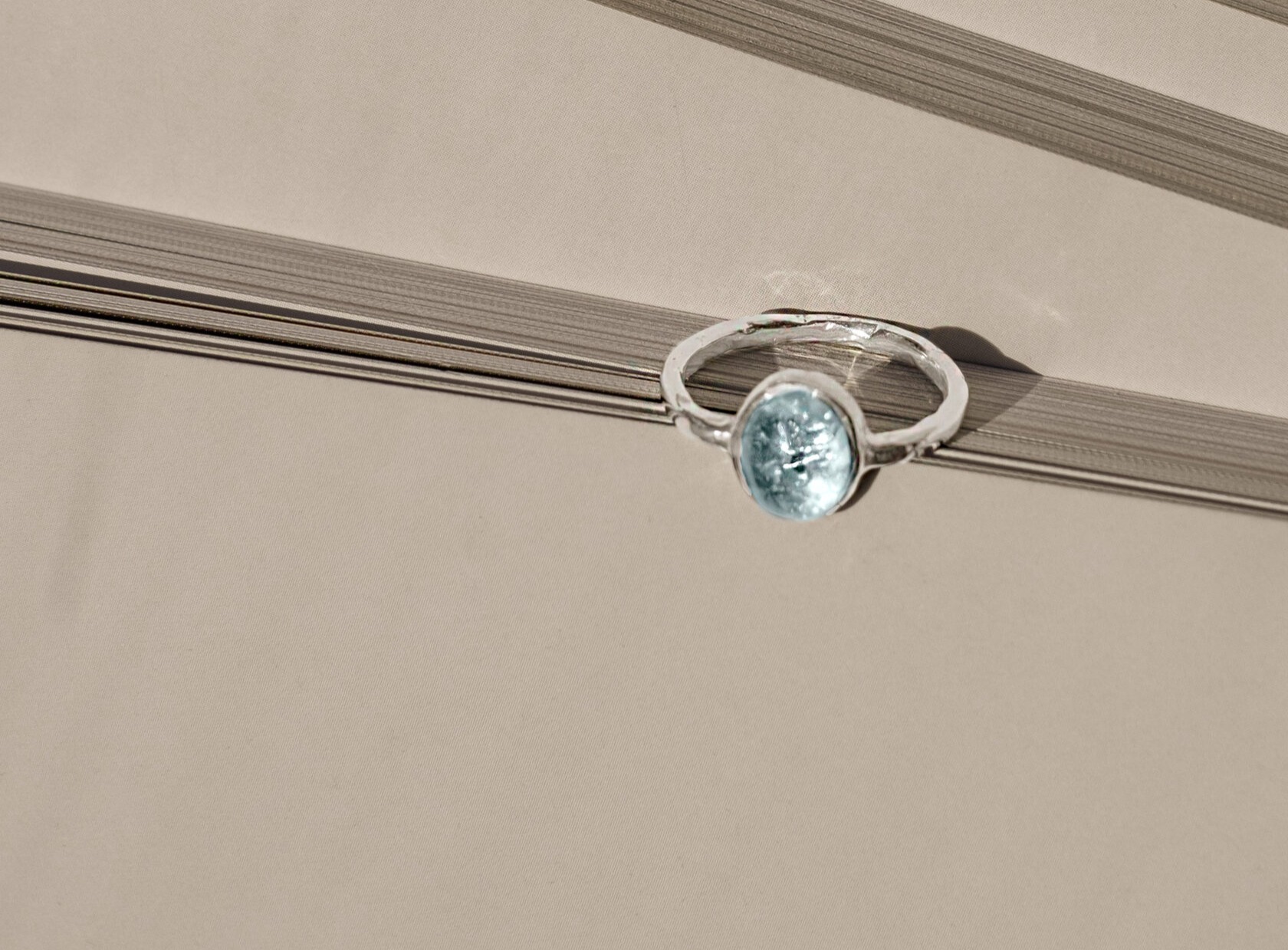 Натуральный топаз нежнейшего голубого оттенка со звездными искрами серебра. Специальная обработка кольца под ним позволила создать этот глубокий трогательный мотив про ощущение волшебства и свежего морского воздуха.