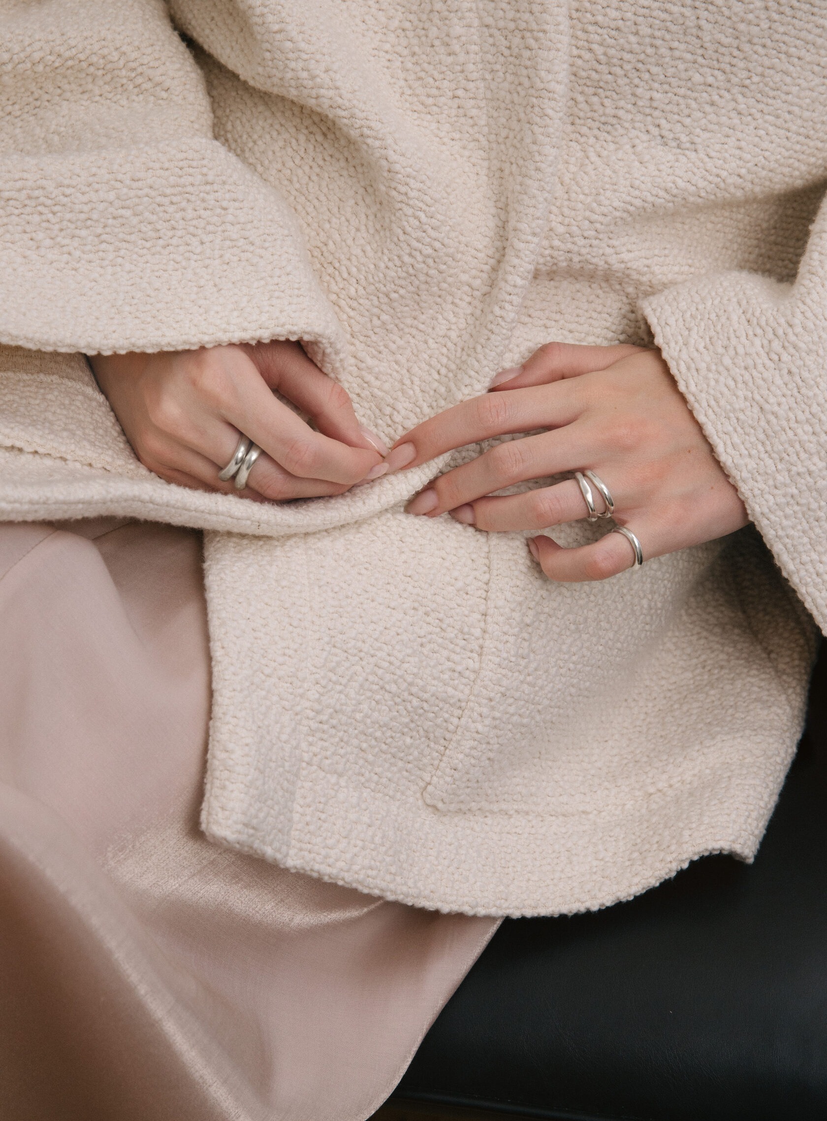 Название коллекции "Тепло" отсылает к тому, как создавался образ этих украшений: каждая модель и каждый отдельный размер колечка из этой линейки проектировались руками по мягкому воску. Под воздействием тепла ладоней воск таял и приобретал анатомичные изгибы, а поглаживающим движением пальцев получилось создать такую гладкую сатиновую поверхность. В результате украшения этой коллекции ощущаются невероятно комфортно, к ним так и тянет прикоснуться