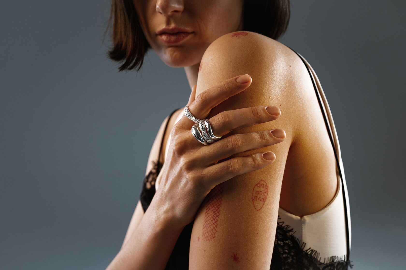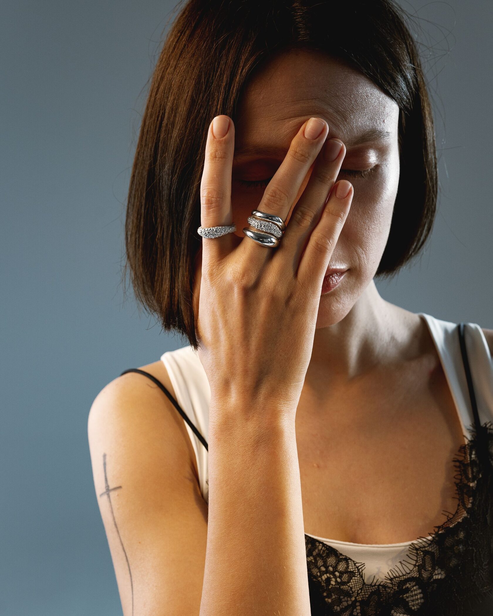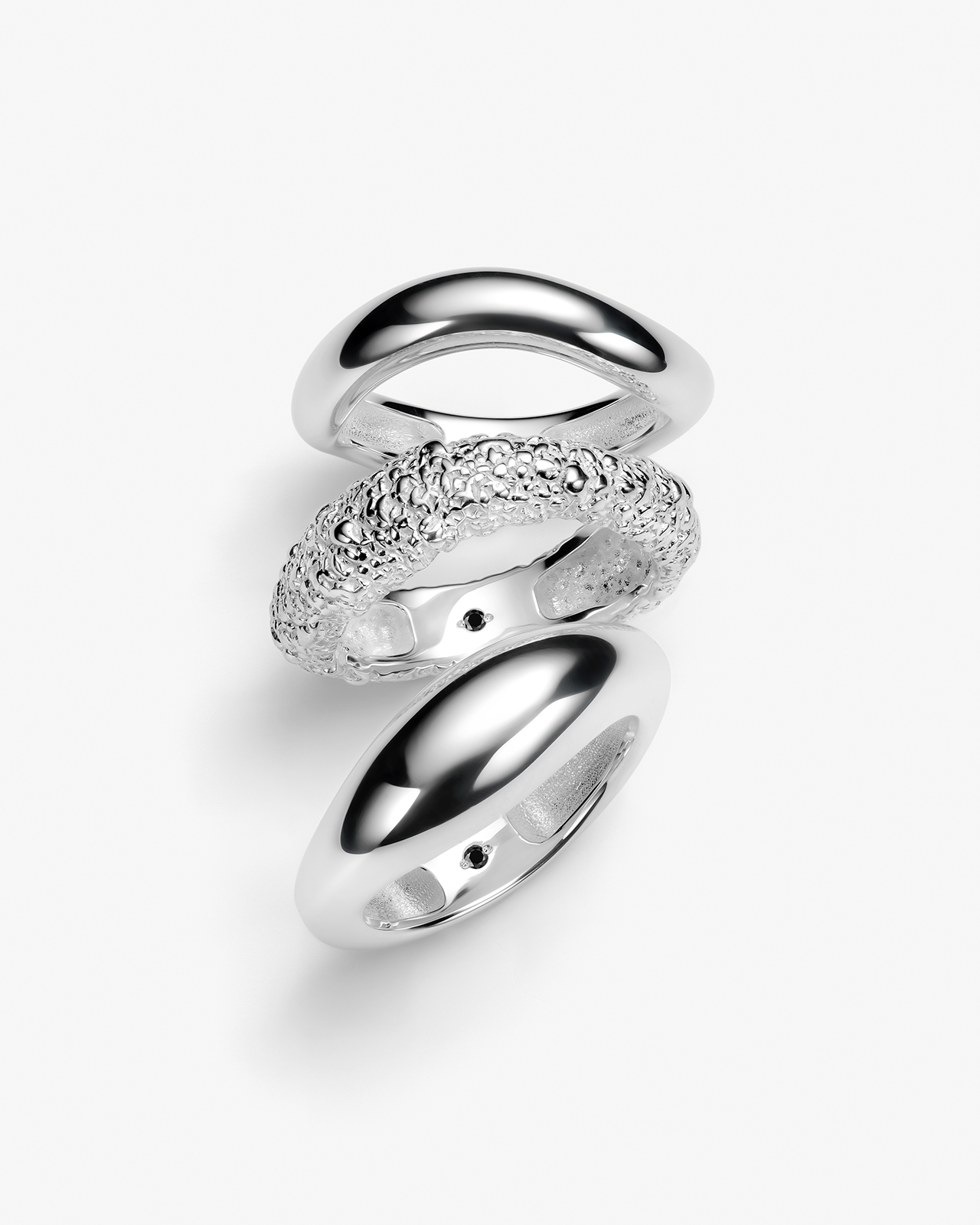 Сет из трех колец, которые можно миксовать так, как вам захочется, но по-особенному он выглядит на одном пальце — не просто как украшения, а как арт-объект. Внутри каждого кольца спрятан маленький чёрный бриллиант, наша точка сборки.